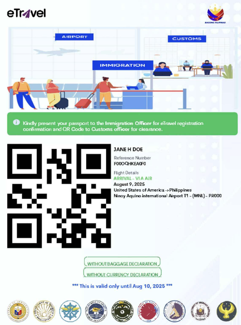 All travelers visiting for tourism, visiting friends or family, or transiting through the Philippines (unless remaining in the airside transit area) must complete the Philippines eTravel Declaration online within 72 hours before arrival or departure. Completing the Philippines Arrival Card ahead of time ensures compliance with border regulations and facilitates smoother processing at immigration and customs checkpoints. For the Philippines border authority services related to travel, please visit etravel.gov.ph